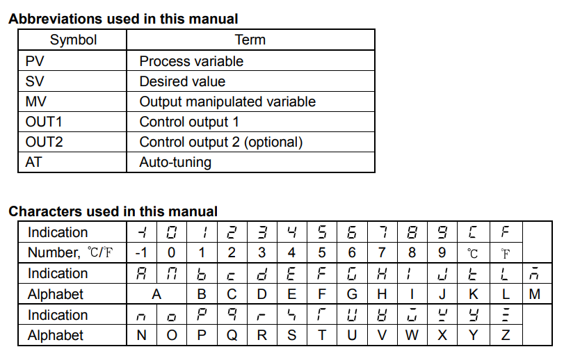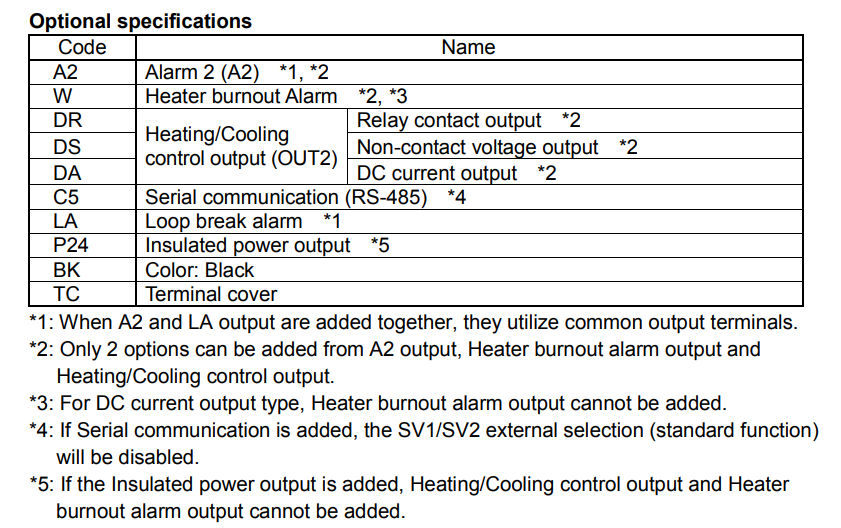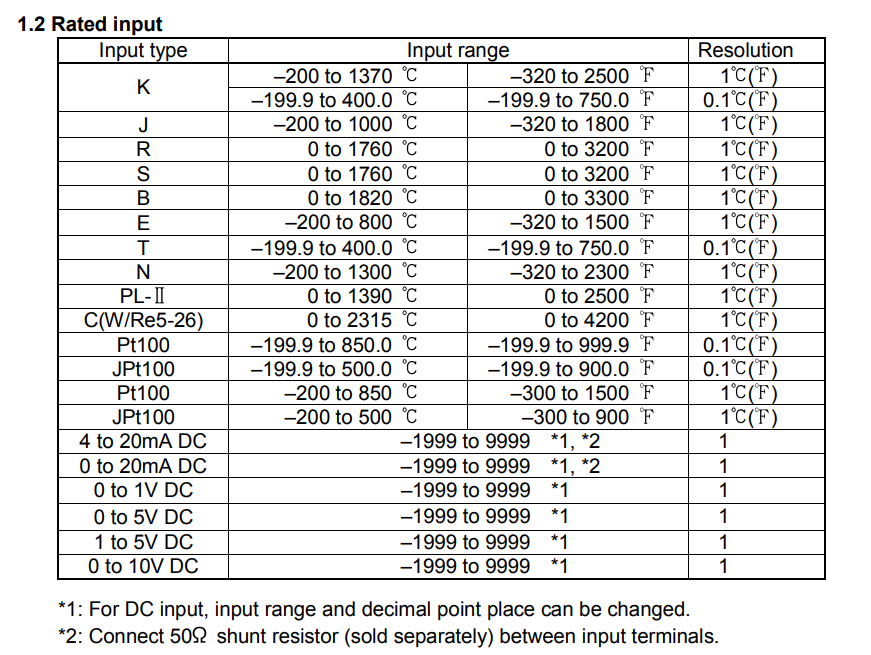 • อินพุต (Input types) ได้แก่ Thermocouple (K, J, E, T, N, R, S, B, etc.), RTD (Pt100, JPt100) และสัญญาณ DC (0-5V, 1-5V, 0-10V, 4-20mA)