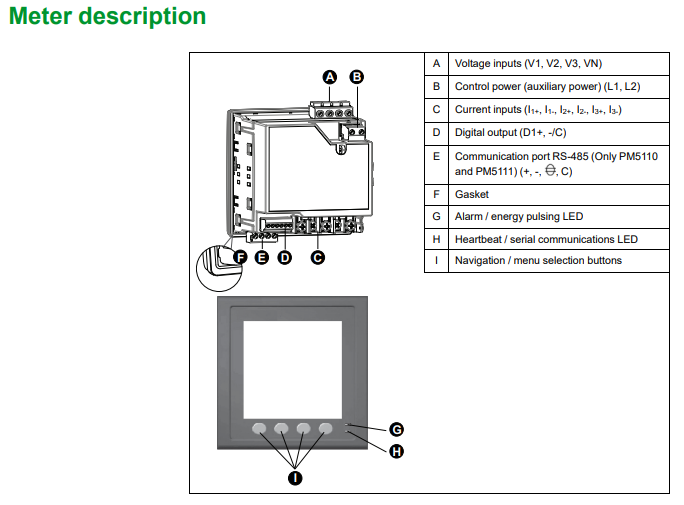 A - Voltage inputs (V1, V2, V3, VN) B - Control power (auxiliary power) (L1, L2) C - Current inputs (I1+, I1-, I2+, I2-, I3+, I3-) D - Digital output (D1+, -/C) E - Communication port RS-485 (Only PM5110 and PM5111) (+, -, , C) F - Gasket G - Alarm / energy pulsing LED H - Heartbeat / serial communications LED I - Navigation / menu selection buttons